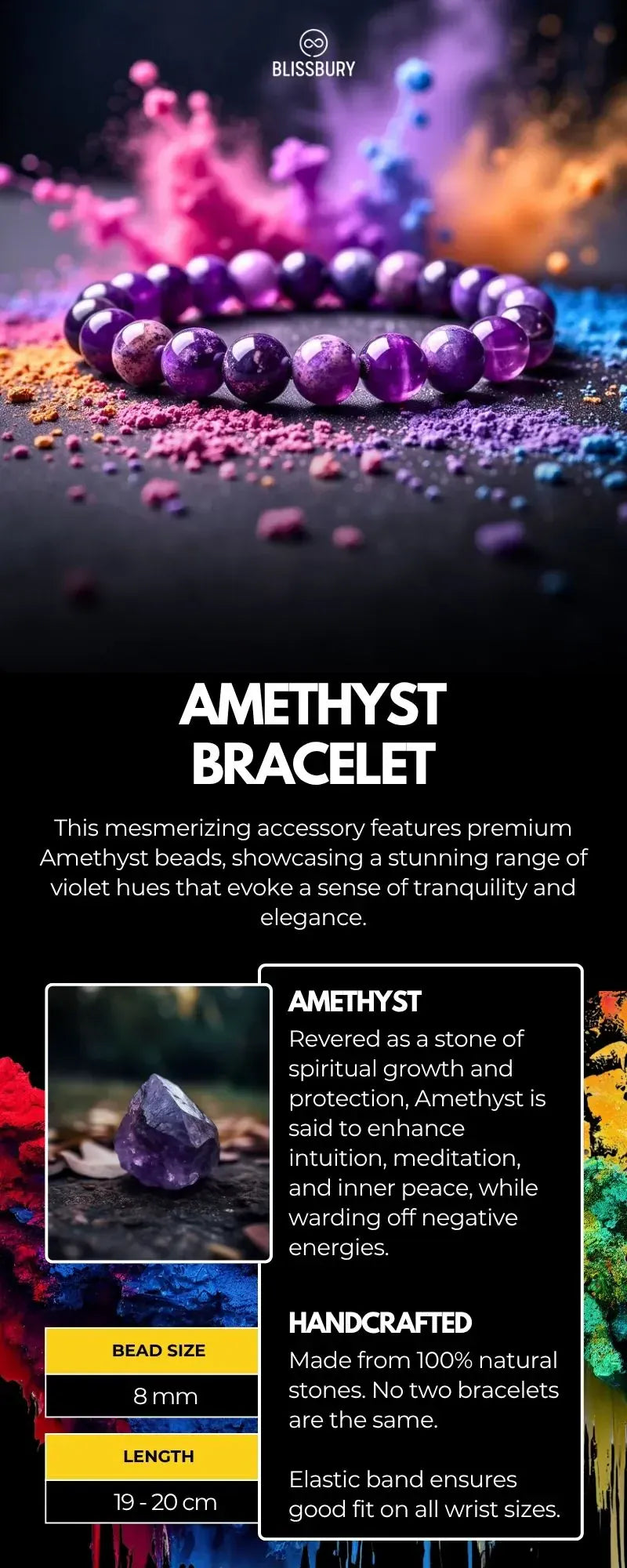 Experience the serene elegance and spiritual power of the Amethyst Bracelet, and embrace the enhanced intuition, tranquility, and well-being it brings to your life.