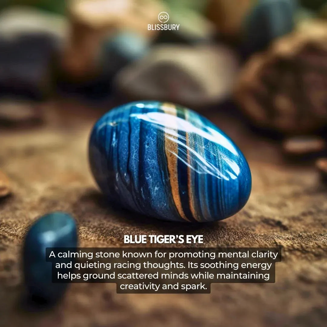 Unlike regular tiger's eye with its fiery energy, the blue variety carries a cooling, centering quality. It helps quiet the mental chatter without dulling your creativity or natural spark.