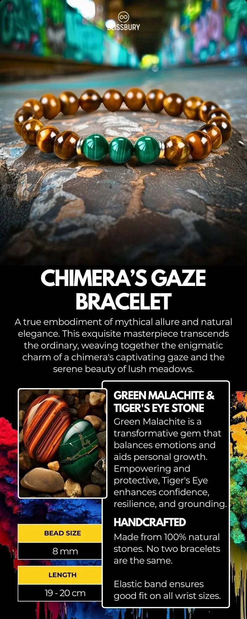 Yet, this bracelet's tale doesn't end with the malachite's allure. Woven seamlessly into the strand are golden tendrils of Tiger's Eye stones, a symphony of radiant hues that tell the story of a sun-kissed meadow where the chimera roams.