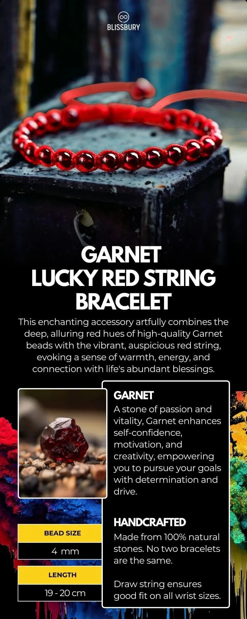 Embrace the passionate allure and invigorating energy of the Garnet Lucky Red String Bracelet, and experience the enhanced passion, protection, and prosperity it brings to your life.