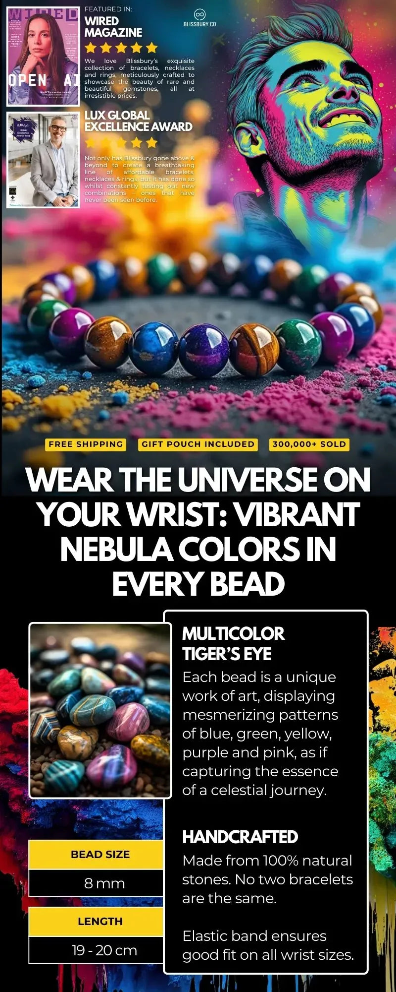 Step into the enchanting realm of the cosmos with our Nebula Tiger's Eye Bracelet. This captivating piece showcases polished tiger's eye beads in a breathtaking array of vibrant hues, reminiscent of the mystical colors found in nebulas.