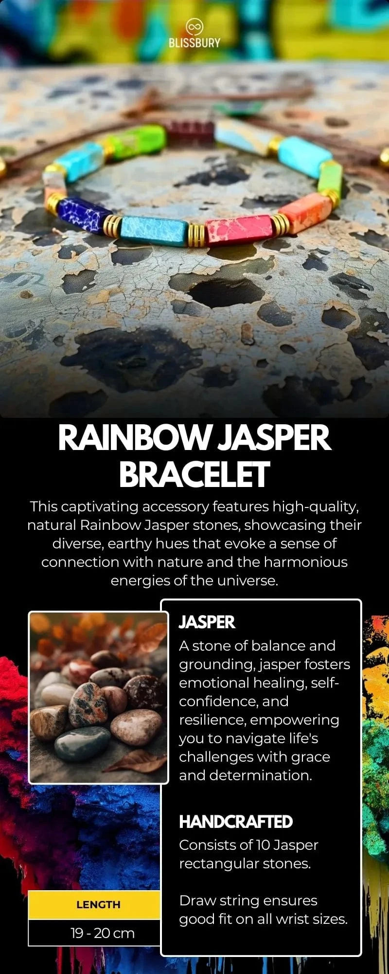 This captivating accessory features high-quality, natural Rainbow Jasper stones, showcasing their diverse, earthy hues that evoke a sense of connection with nature and the harmonious energies of the universe.