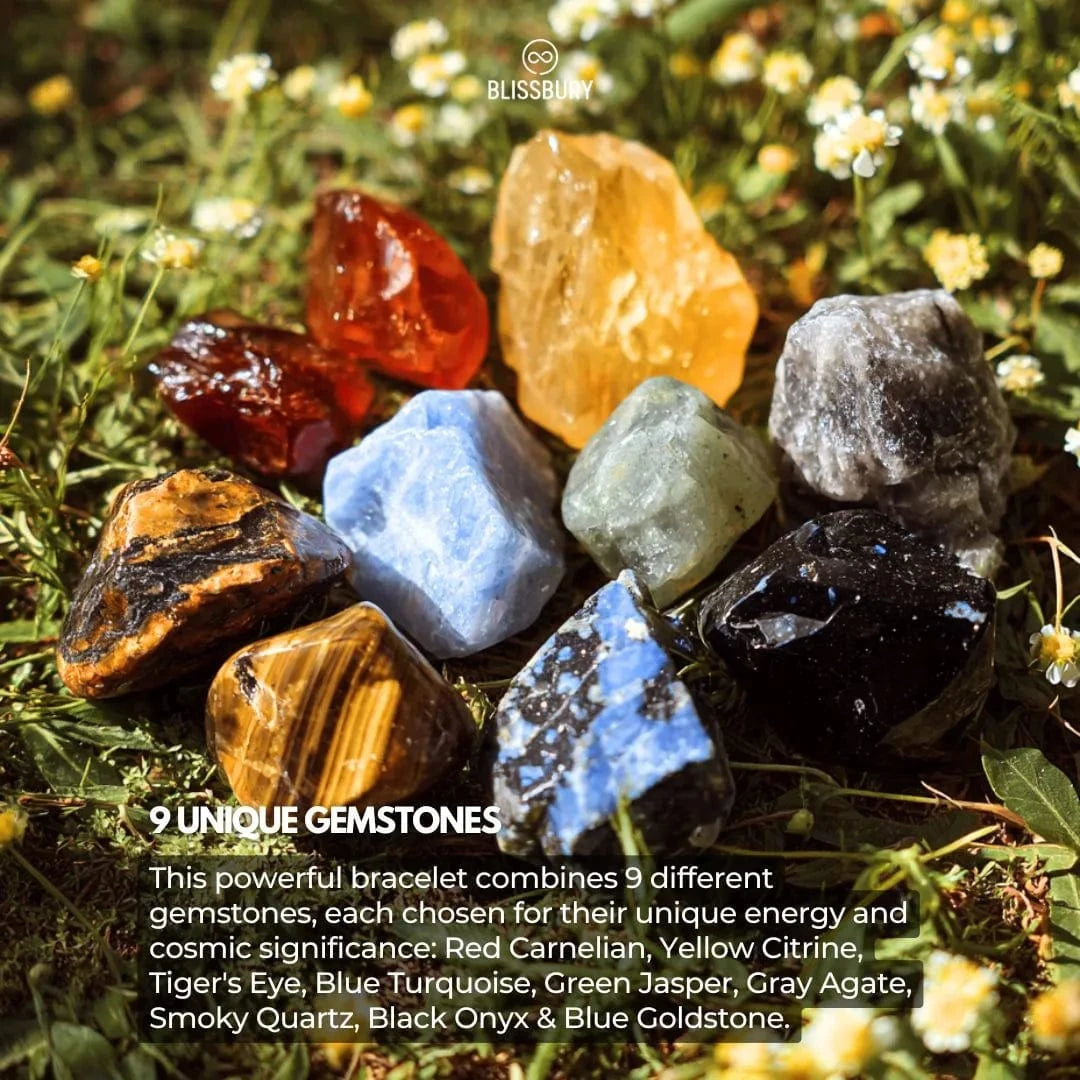 This powerful bracelet combines 9 different gemstones, each chosen for their unique energy and cosmic significance: