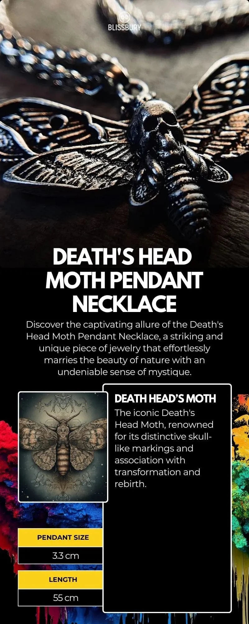 This enchanting necklace pays homage to the iconic Death's Head Moth, renowned for its distinctive skull-like markings and association with transformation and rebirth.