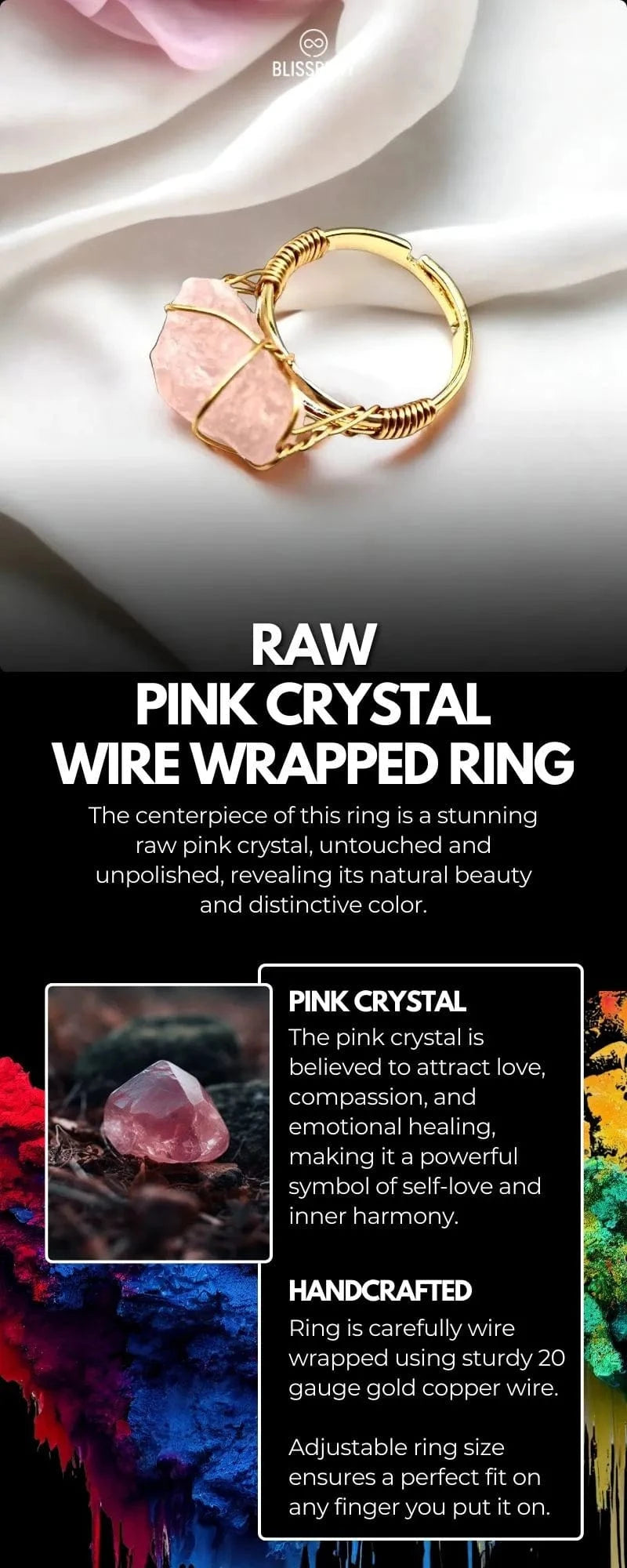Each ring is meticulously handcrafted, with delicate wire wrapping that securely holds the raw pink crystal in place.