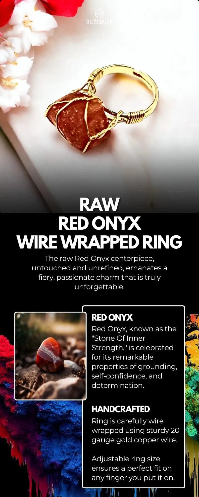 Each ring is meticulously handcrafted, featuring intricate wire wrapping that securely embraces the raw Red Onyx stone.